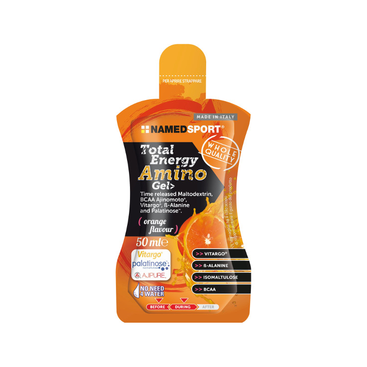 TOTAL ENERGY AMINO GEL de NamedSport es un suplemento dietético destinado a mejorar el rendimiento de los deportistas. Basado en la maltodextrina con lentitud diferenciada, contiene fructosa, Vitargo e isomaltulosio Palatinosa, sustancias que proporcionan energía constante y prolongada. Enriquecido con aminoácidos ramificados Ajipure y glucogénico, como la alanina y la glicina, facilita los procesos de síntesis de glucosa. Sin gluten, tiene sabor a naranja.