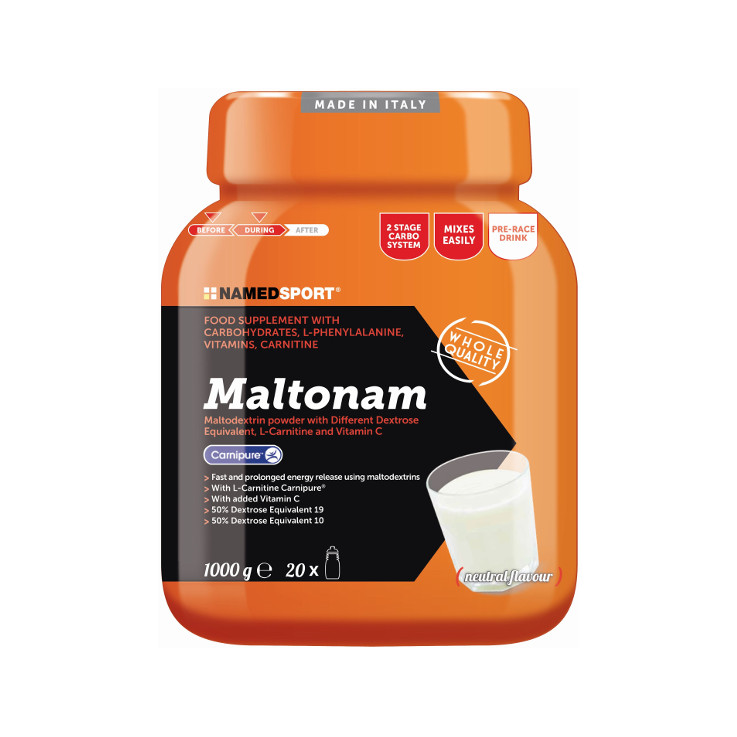 MALTONAM de NamedSport es un complemento alimenticio a base de maltodextrina y enriquecido con carnitina, l-fenilalanina y vitaminas. Elaborado por Namedsport, este suplemento viene en forma de polvo, para tomarse después de diluirlo en agua. La formulación particular, basada en hidratos de carbono simples y complejos, garantiza un importante apoyo energético. Además, la presencia de vitaminas ofrece apoyo tanto contra el estrés oxidativo como contra la fatiga física.